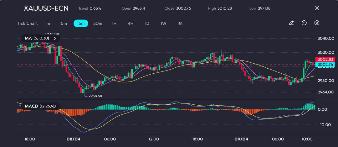 The XAU/USD pair, as shown on the 15-minute chart, plunged to an intraday low of $2,958.58 before recovering to close at $3,002.76, with a session high of $3,010.28. This rebound coincided with a bullish MACD crossover, supported by a shift in the histogram into positive territory, while price action reclaimed all key moving averages (5, 10, 30), confirming short-term strength.