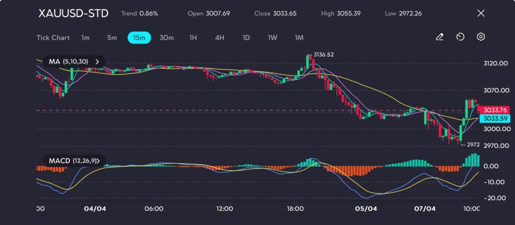 Gold prices experienced a sharp rebound on Monday, climbing to $3,033 per ounce after earlier falling to the lowest levels in more than three weeks. The drop triggered concerns that market participants were liquidating positions to cover losses or margin calls from other asset declines, driven by fears of a global recession from escalating trade tensions.