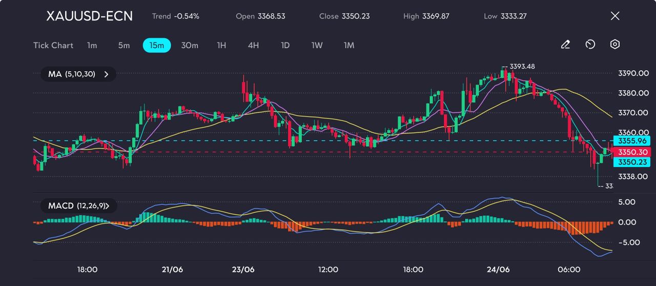 Gold retreated sharply on Tuesday after U.S. President Donald Trump announced a “complete and total” ceasefire agreement between Israel and Iran. Spot gold dropped 0.6% to $3,349.89 an ounce, while U.S. futures fell 0.9% to $3,364.20. This marked gold’s weakest level since 11 June.