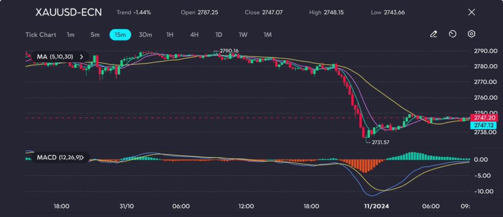 Picture: Gold prices steady at $2,747, as bearish momentum persists with potential for further consolidation, as seen on the VT Markets app.
