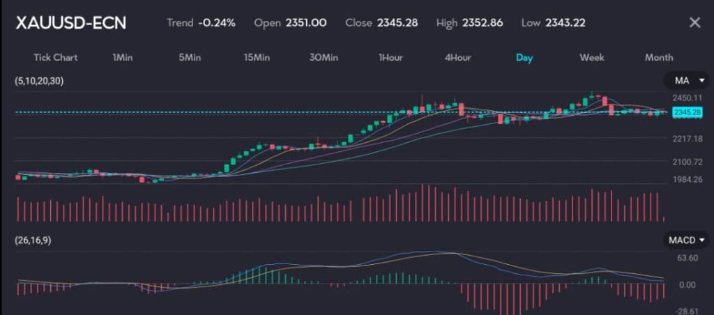 Picture: Gold prices trading at 2345.28 as seen on the VT Markets app.
