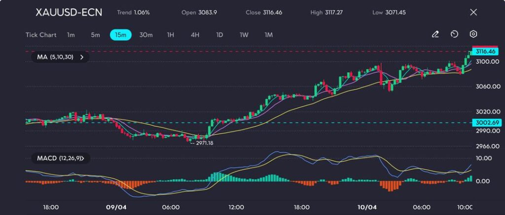 Gold extended its sharp upward trajectory on Thursday, rising over 1% intraday to reach $3,116.46/oz, as a worsening trade war between the U.S. and China sent traders rushing back into the precious metal. The move follows a more than 3% surge from the previous session, with XAU/USD rebounding from a low of $2,971.18 to decisively break the $3,100 resistance level.