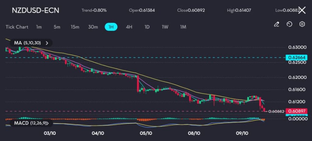 Picture: NZD/USD continuing its downward trend as it approaches critical support near 0.6090 on the VT Markets app.