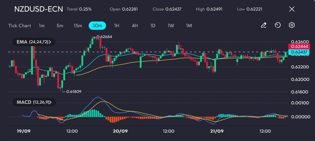 The NZD/USD pair is currently trading around the 0.6244 level, after reaching an intraday high of 0.6249. The price is showing signs of consolidation, as traders continue to evaluate economic data and potential central bank actions.