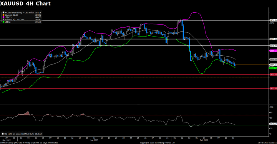 From the technical perspective, the four-hour scale RSI indicator further declined to 37 figures as of writing, suggesting that the pair was confronting heavy selling pressure. As for the Bollinger Bands, the gold continued to price along with the lower band, showing the pair was amid strong bearish traction. We think the yellow is more favorable to the downside path shortly before the CPI inflation report.