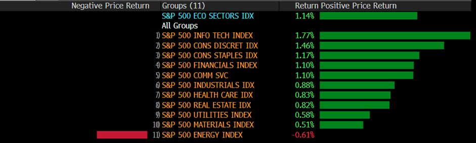 The benchmarks, S&P 500 and Dow Jones Industrial Average both advanced higher on Monday as the S&P 500 closed higher when traders brace for the Consumer Price Index (CPI) for January amid mixed clues. The S&P 500 was up 1.1% daily and the Dow Jones Industrial Average also climbed higher with a 1.1% gain for the day. Ten out of eleven sectors in the S&P 500 stayed in positive territory as the Information Technology sector and the Consumer Discretionary sector are the best performing among all groups, rising 1.77% and 1.46%, respectively. The Nasdaq 100 meanwhile rose the most with a 1.6% gain on Monday and the MSCI World index was down 0.3% for the day.