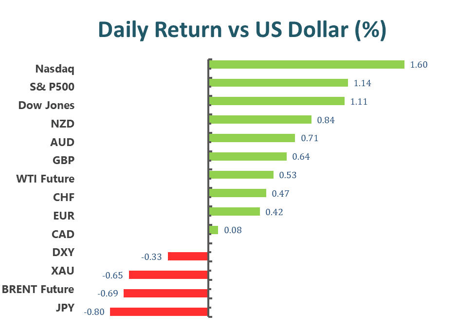 US stocks advanced higher on Monday, witnessing upside strength, and ended the previous day with broad gains amid the market’s mildly positive sentiment. The better market mood during European trading hours pushed the US Dollar into the red across the FX board and provided firm support to equity markets.