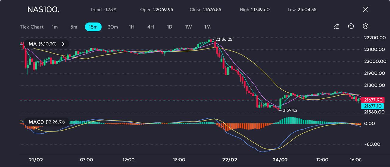 Picture: Nasdaq 100 drops 1.78% to 21,676.85 after peaking at 22,186.25, as tech stocks retreat ahead of key data, as seen on the VT Markets app