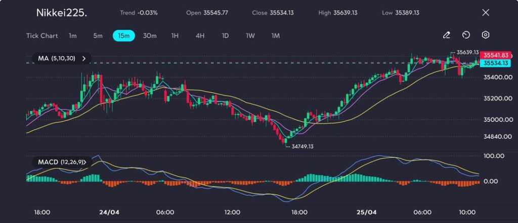 The Nikkei225 rebounded sharply from the intraday low of 34,749.13, carving out a strong recovery trajectory into 25 April. Price action reclaimed the 30-period moving average, with successive green candles forming a stair-stepping uptrend toward 35,639.13, the current resistance zone.