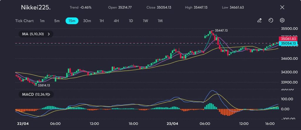 The Nikkei 225 staged a strong bullish rally, climbing from the 33814.13 low to a session high of 35447.13, marking a 1,600+ point run before facing a sharp correction. The price action hugged the 5- and 10-period moving averages during the ascent, signaling persistent buying pressure.