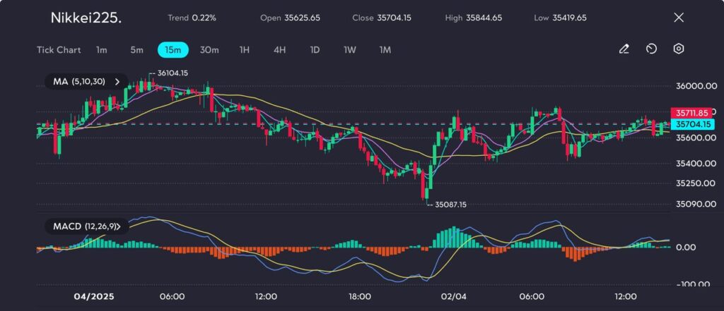 The Nikkei 225 on the 15-minute chart shows a sharp drop from the high of 36104.15 down to a low of 35087.15, followed by a gradual recovery phase. After the dip, buyers stepped in with increasing momentum—evident from the MACD crossing into bullish territory and the histogram turning green. Price has since climbed back above 35700, though it’s currently struggling to gain clear direction, with movement consolidating sideways.