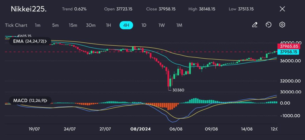 On the charts, the 4-hour chart for Nikkei 225 displays a notable recovery from the 30380 low in early August, with the index currently trading near 37958.15, just below a key resistance level at 37965.85. The upward momentum has been supported by the moving averages (EMA 24, 24, 72) beginning to trend upward, suggesting bullish sentiment.