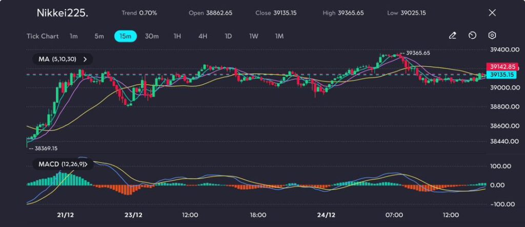 The Nikkei225 advanced slightly, pausing near the upper 39,000 range. Short-term moving averages (MA5, MA10, MA30) on the 15-minute chart hover close to the current price, signalling that bullish momentum has softened but not reversed.