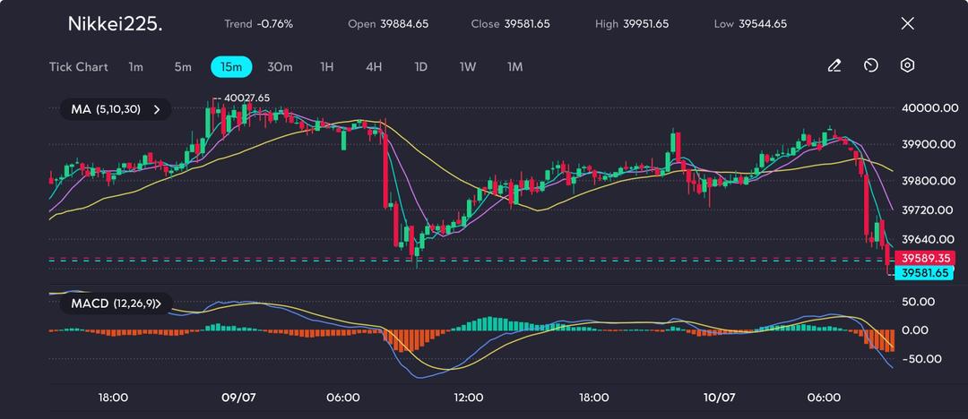 Picture: Nikkei 225 tumbles below 39,600 as risk-off mood takes hold, as seen on the VT Markets app