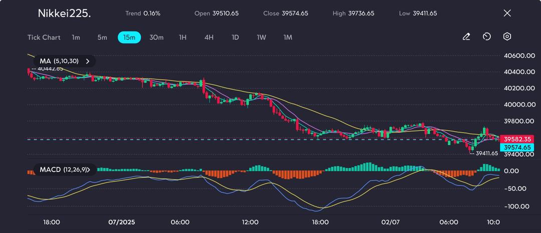 The Nikkei 225 has been in a clear downtrend since peaking near the 40,000 mark earlier in the week, with the price slipping to a low of 39,411.65. The 5, 10, and 30-period moving averages remain sloped downward and are currently acting as dynamic resistance. Despite minor intraday bounces, momentum has been mostly bearish, as reflected in the MACD staying below the zero line for most of the session.