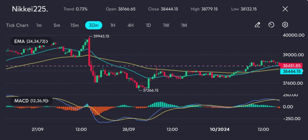 Market participants are closely monitoring U.S. economic developments, which have been driving global market sentiment. If the Nikkei manages to break above the resistance at 38,779.15, further gains could follow, while a break below 38,132.15 might signal a retracement towards the lower support levels around 37,266.15.