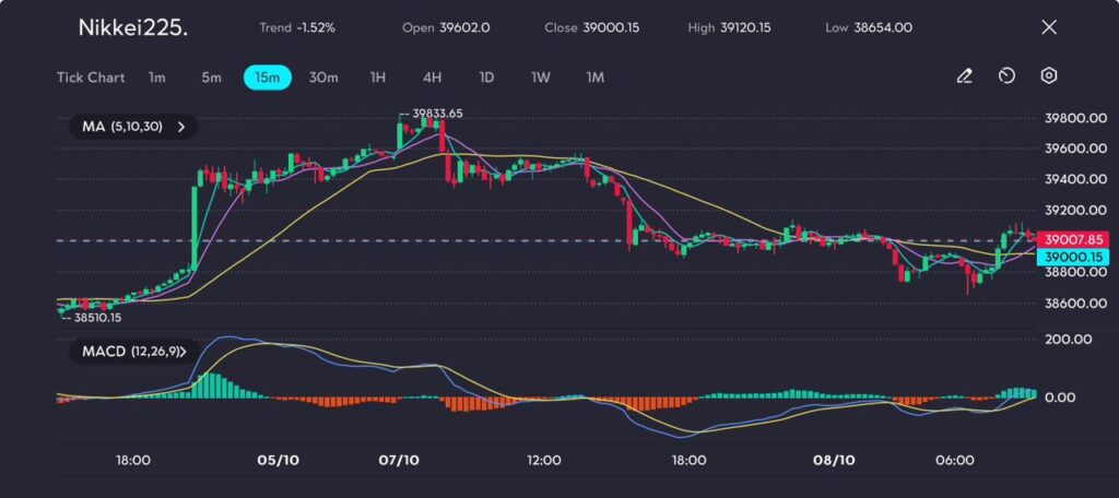 Picture: The Nikkei225 retraces to 39,000, facing resistance after reaching a high of 39,833 as traders eye U.S. data for market direction, seen on the VT Markets app.