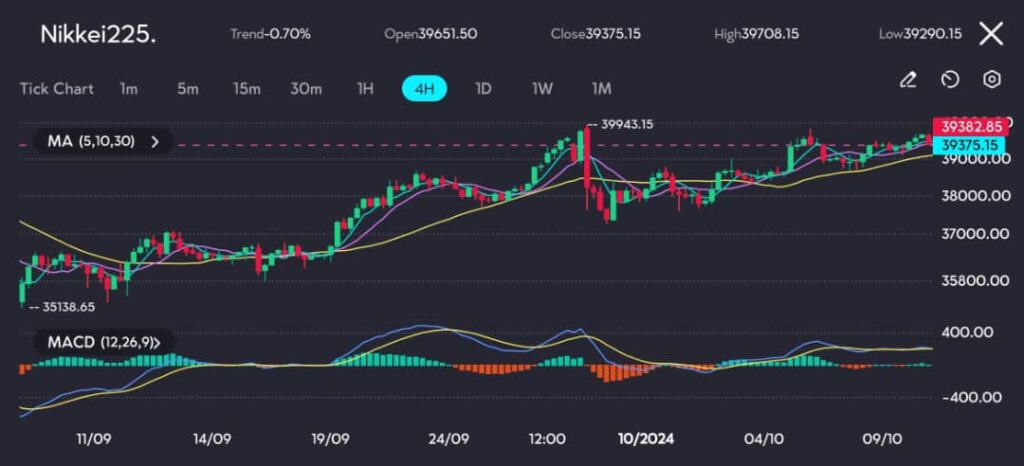 See: Nikkei 225 is consolidating near 39,375 after reaching a recent high of 39,708 on the VT Markets app.