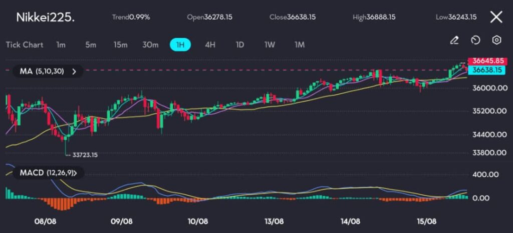The 1-hour chart for Nikkei225 shows a consistent uptrend, with the index closing at 36,638.15, just below the session high of 36,888.15. The chart indicates strong bullish momentum as reflected by the MA (5, 10, 30) lines that are trending upwards, and the MACD histogram shows a positive signal with the MACD line above the signal line, confirming the strength of the buying pressure.