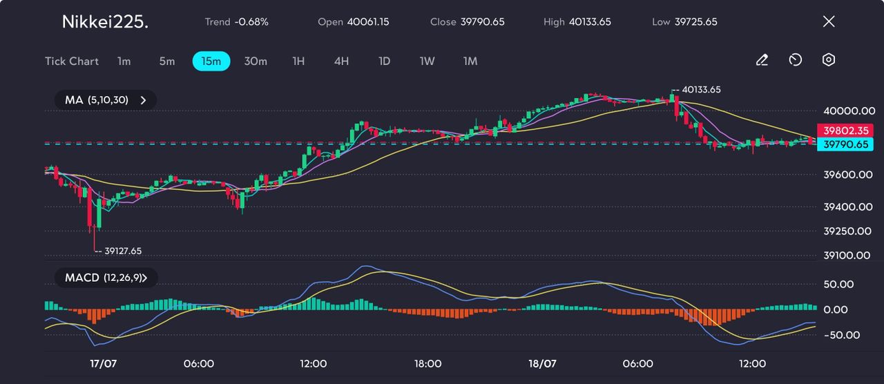 Picture: Nikkei trims gains after hitting 40,133. MACD hints at recovery, but bulls need to reclaim 39,800+, as seen on the VT Markets app