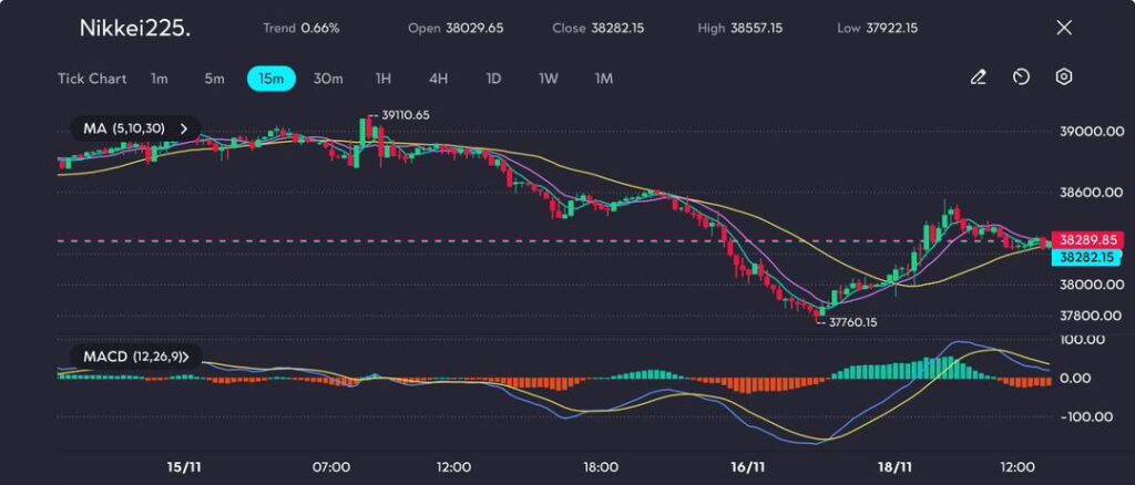 - Nikkei 225 closed at 38,282.15, down 0.66%, after fluctuating between 39,110.65 and a low of 37,922.15.