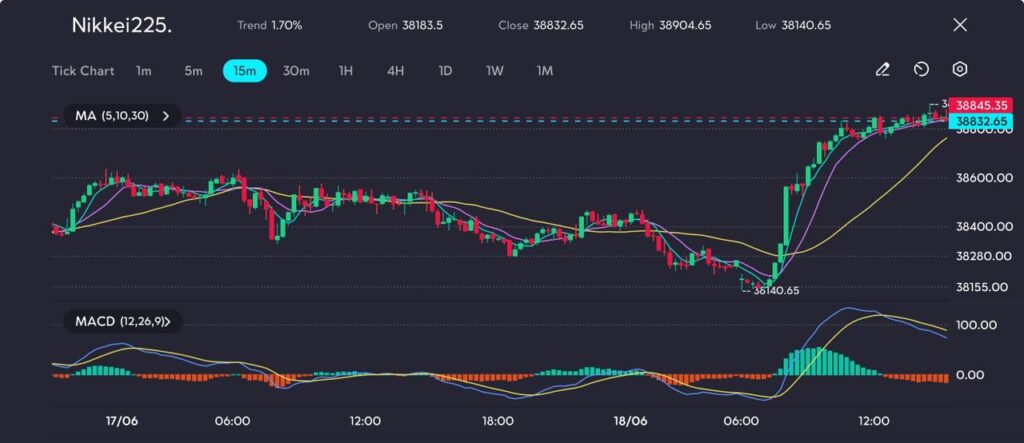 The Nikkei 225 surged strongly in the latter half of this 15-minute chart, closing at 38,832.65, up over 1.70% from the session open. After consolidating sideways throughout much of June 17 and into early June 18, the index formed a bullish breakout from the 38,140.65 support base, marking a powerful rally that touched a session high of 38,904.65 before tapering slightly near close.