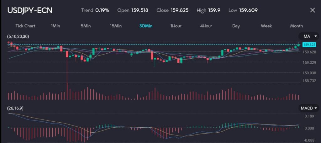 See: USD/JPY trading at 159.825 as seen on the VT Markets app.