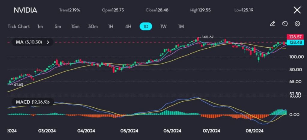 The chart indicates a bullish trend, with the stock price trading above key Moving Averages (5, 10, 30), which are all sloping upwards, reinforcing the positive momentum. The MACD indicator also signals strong bullish momentum, with the MACD line well above the signal line and the histogram showing increasing positive momentum. This suggests that Nvidia’s stock may continue to climb, especially if the earnings report meets or exceeds market expectations.