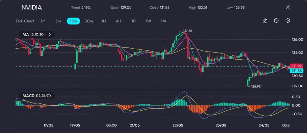 Shares in Nvidia (NVDA) drifted lower on Tuesday after a strong rally to $137.35 lost momentum, closing the session at $131.88. The chart reflects a clear rejection near the highs of $132.61, with the stock consolidating after a steep correction on 22 May. The 15-minute chart highlights choppy price action and a weakening MACD, as momentum cools in the lead-up to the firm’s widely anticipated earnings release on Wednesday.