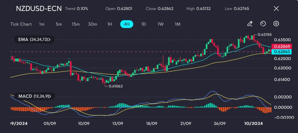 The NZD/USD pair closed at 0.62862, with the market appearing to stabilise following recent geopolitical tensions. Iran’s statement that it has concluded its military response, unless further provoked, has calmed the market somewhat, contributing to the stabilisation of risk sentiment.