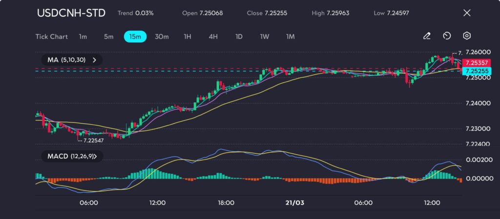 The offshore yuan (USDCNH) increased by 0.03%, closing at 7.25255 after opening at 7.25068. The session saw a steady upward movement, reaching a high of 7.25963 before retracing slightly and closing just below the day’s peak.