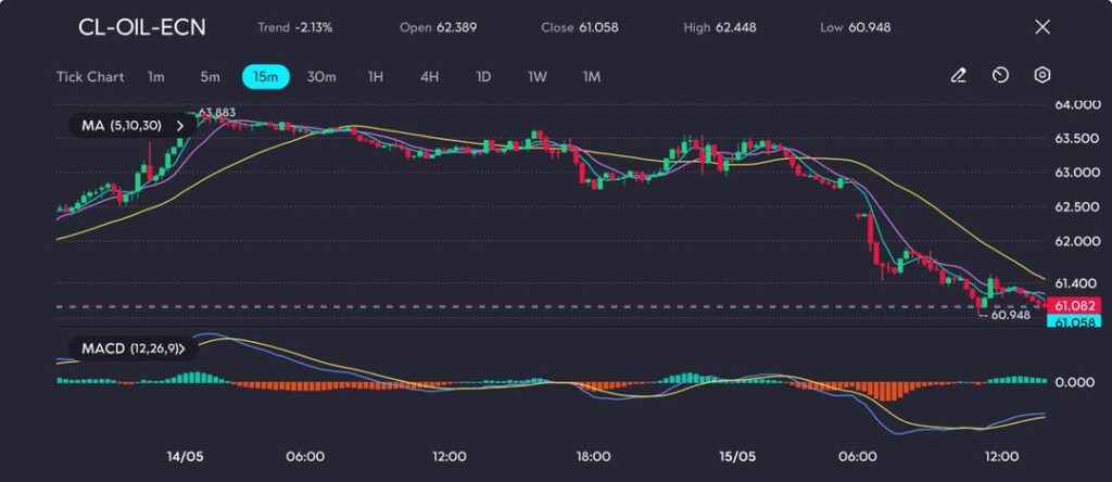 Oil prices have extended their downward correction, with CL-OIL-ECN dropping sharply from $63.88 to a session low of $60.95, marking a two-day slide of over 4.5%. The chart shows a sustained break below the 5-, 10-, and 30-period moving averages, reinforcing a bearish short-term trend. The selling pressure intensified as price breached prior support near $62.00, with weak buying interest evident on the recovery attempts.