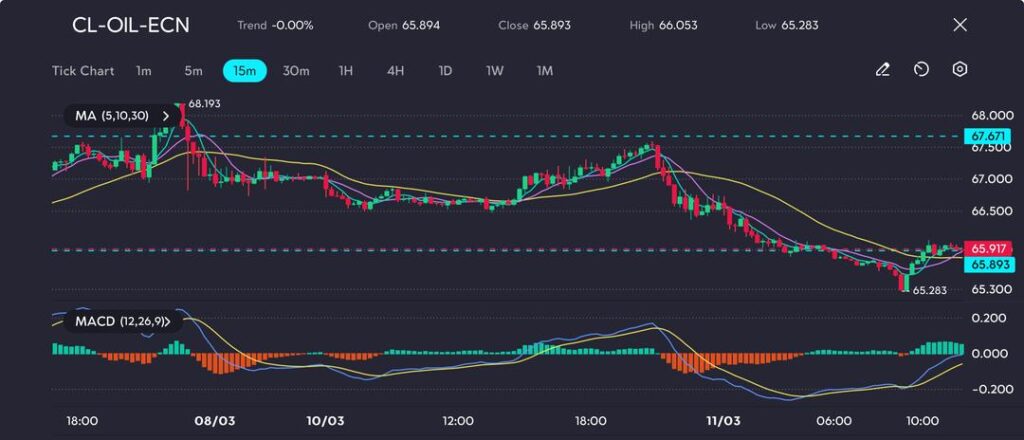 Crude oil is trading flat at $65.893, with the price showing little net change. The session saw a high of $66.053 and a low of $65.283, indicating a range-bound movement after recent declines. The moving averages (5, 10, 30) suggest ongoing consolidation, while the MACD shows early signs of a bullish crossover, hinting at a potential short-term recovery.