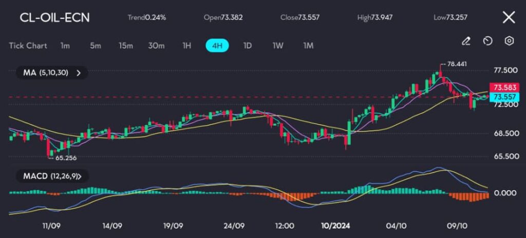 See: Oil prices are consolidating around $73.55 after a recent high of $78.44 as shown on the VT Markets app.