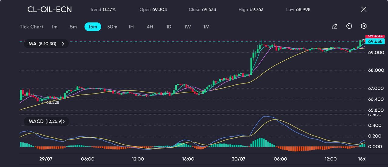 After finding strong support around $66.20 on 29 July, crude oil reversed its previous downtrend and built a steady series of higher lows. The chart shows a sharp breakout from the narrow consolidation band late on 30 July, with price surging past $69.00 and closing the latest candle at $69.638.