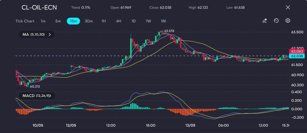 Crude oil (CL-OIL-ECN) saw a sharp breakout from the $60.21 support zone, lifting aggressively to test a local peak of $63.58 before retracing. The move was driven by a strong MACD crossover and rising histogram bars, signalling bullish momentum through the early stages of 13 May. However, the subsequent decline pulled the price back below the 10- and 30-period moving averages, and the MACD has since flattened, suggesting a potential shift toward consolidation.