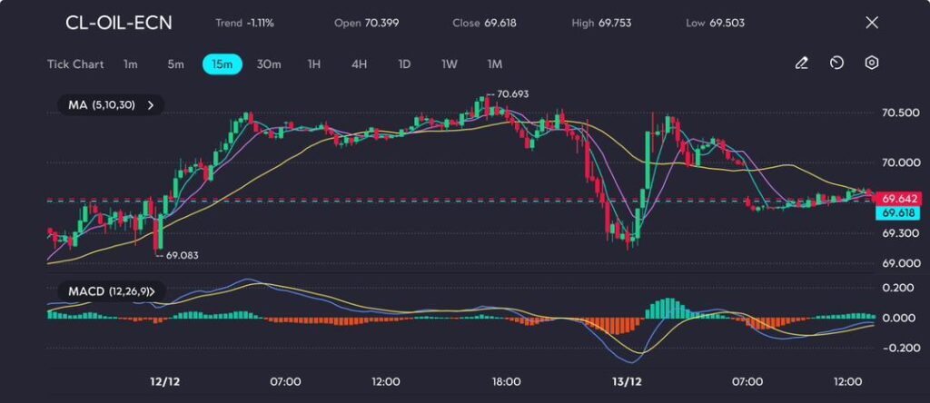 - WTI closed at $69.618 after hitting a session high of $70.693 and a low of $69.083, reflecting a tight trading range.