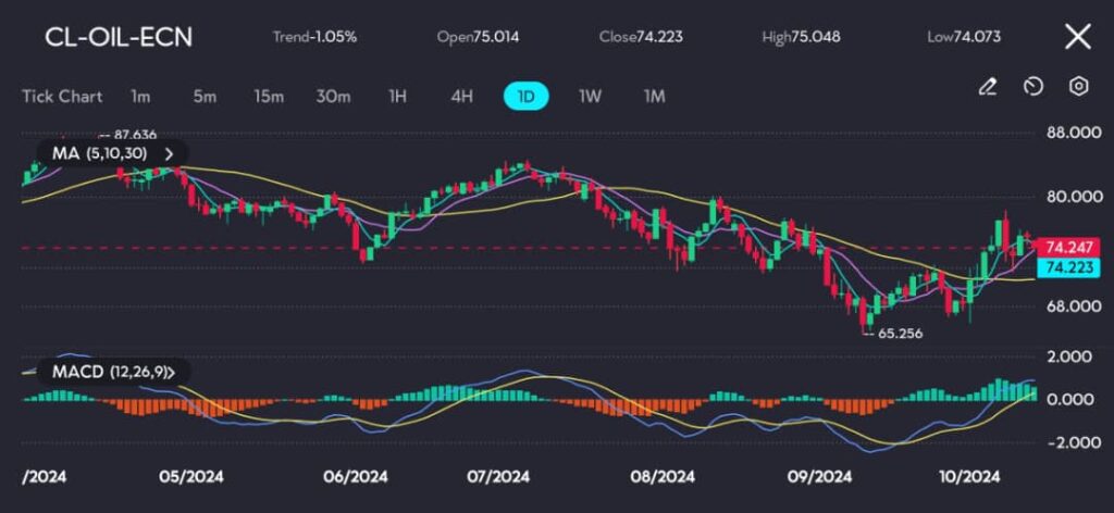 Picture: Crude oil rebounds to 74.223, but bullish momentum weakens, as seen on the VT Markets app.
