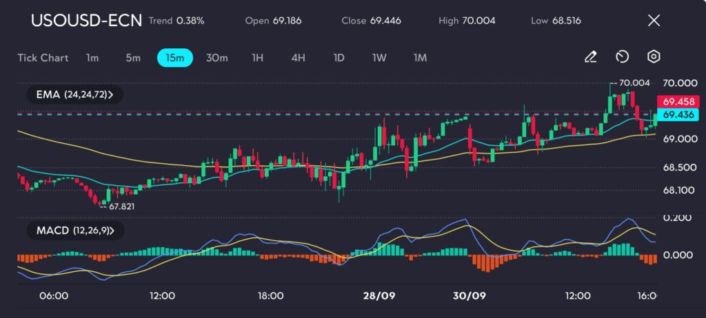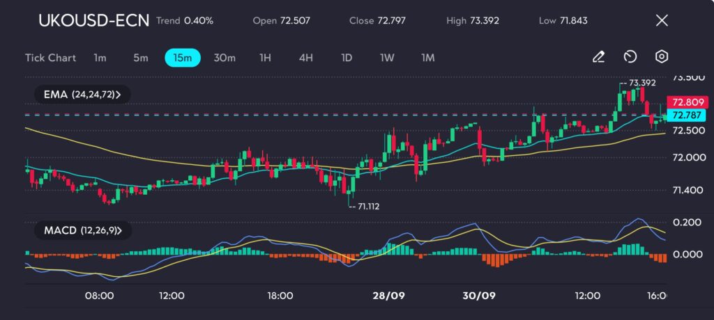 Brent crude oil (Symbol: UKOUSD) rose as high as to $73.392 per barrel, while U.S. West Texas Intermediate (WTI) (Symbol: USOUSD) traded strongly at $70.004 per barrel as of early Monday trading.