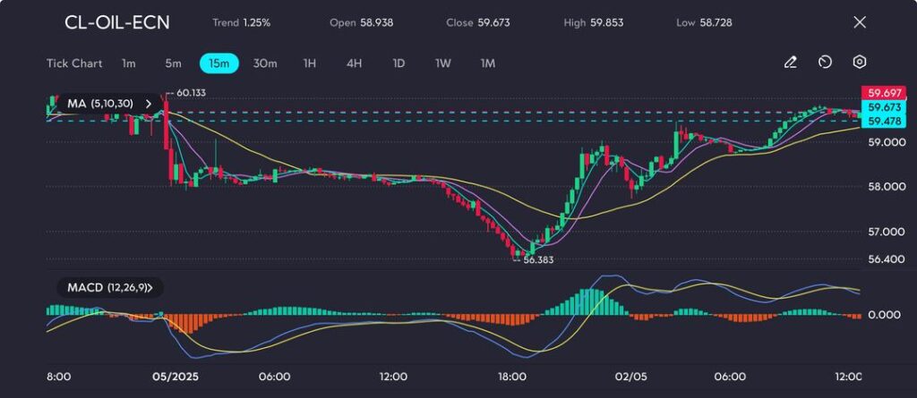 Crude oil has staged a sharp recovery off the $56.38 low, reclaiming ground to close near $59.67. After a steep selloff from $60.13, price consolidated near the lower bound before reversing strongly. The moving averages (5, 10, 30) have now flipped into a bullish alignment, with price holding above all three lines and maintaining an upward trajectory.
