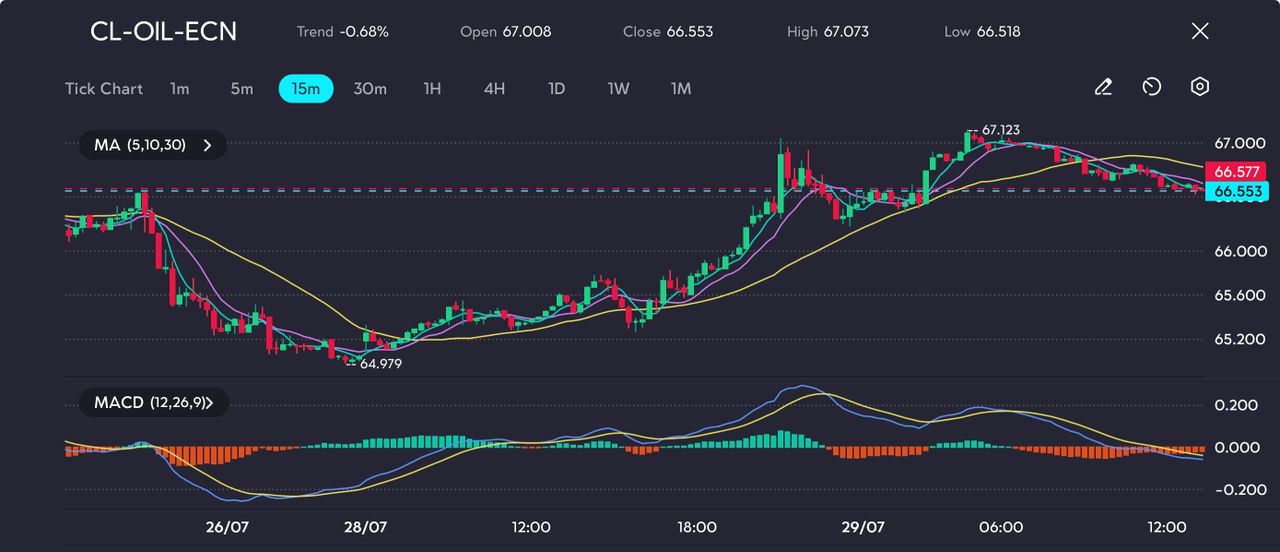 Oil prices lost momentum on Tuesday following a sharp rally in the previous session, as the market digested the broader implications of the new U.S.-EU trade agreement and looked ahead to a pivotal Federal Reserve meeting. West Texas Intermediate (WTI) fell by 0.2% to $66.60 per barrel, while Brent crude eased 0.1% to $69.98.