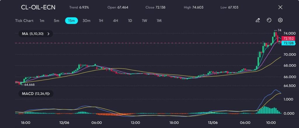 - WTI crude surges to $74.20 after Israeli airstrike on Iranian nuclear targets