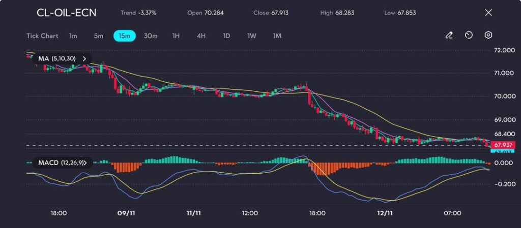 The chart for CL-OIL-ECN shows a clear downtrend, with the price closing at 67.913 and continuing to slide from recent highs around 70.284.