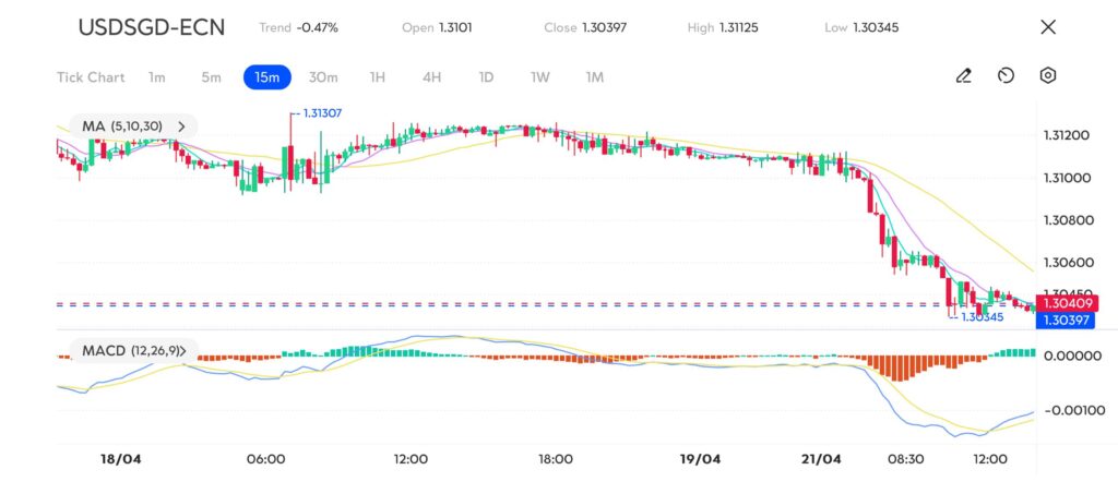 USDSGD decreased by -0.47%, closing at 1.30397 after opening at 1.3101. The pair saw a decline, reaching a low of 1.30345, before retracing slightly to close near 1.30397.