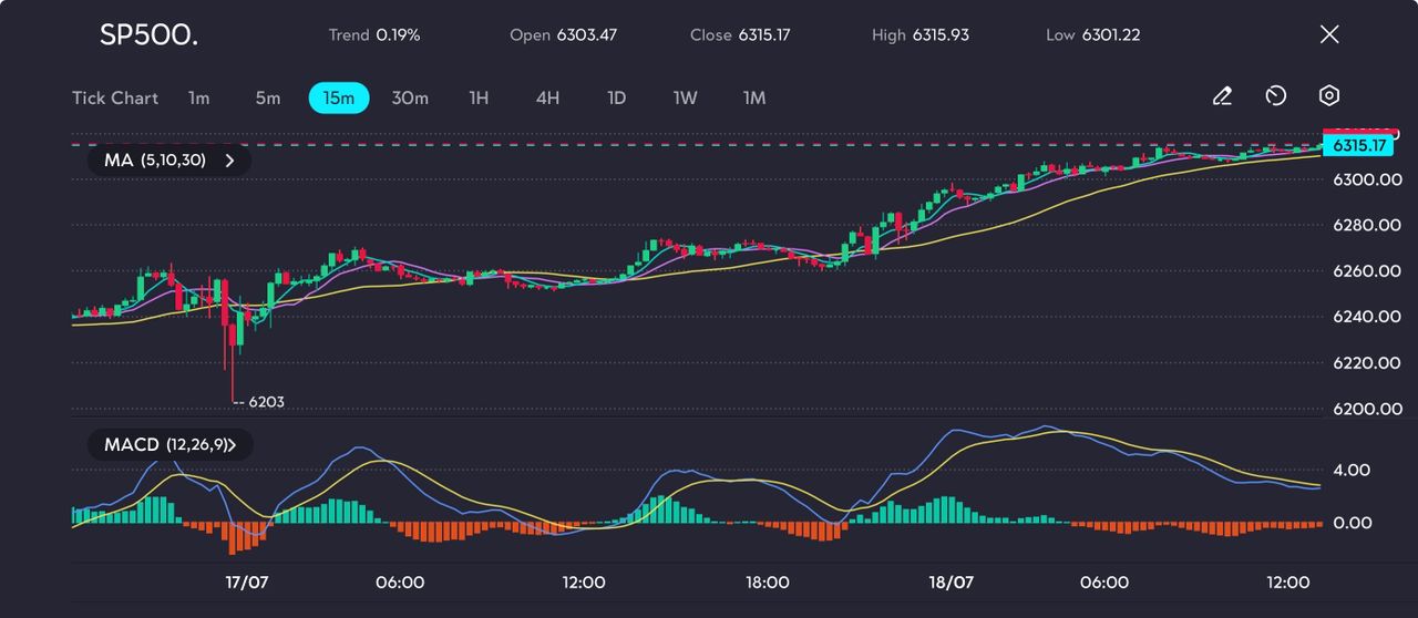 The S&P 500 has been climbing steadily since the dip to 6203 on 17 July, with a near-unbroken run of higher highs and higher lows, now resting just below resistance at 6315.93. The short-term moving averages remain in strong bullish formation (5 > 10 > 30), with price action hugging the trend closely.