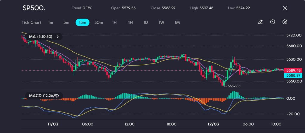 Picture: S&P 500 plunges nearly 9%, closing at 5,588.97 as recession fears drive market uncertainty, as seen on the VT Markets app.