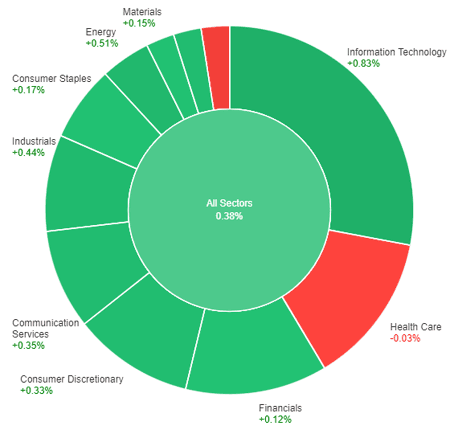 On Wednesday, the S&P 500 showed a 0.38% overall increase. The Information Technology sector led the gains with a significant rise of 0.83%, followed by Energy at 0.51% and Industrials at 0.44%. Communication Services and Real Estate both recorded a 0.35% uptick, while Consumer Discretionary saw a 0.33% increase. Meanwhile, Consumer Staples and Materials experienced more modest growth with gains of 0.17% and 0.15%, respectively. Financials and Health Care registered smaller gains, rising by 0.12% and declining by 0.03%, respectively. Utilities were the only sector to show a notable decrease, falling by 0.42%.