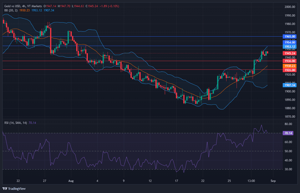 The US Dollar’s decline continued on Wednesday, driving XAU/USD to a four-week high of $1,949.02 per troy ounce, prompted by weak macroeconomic data fueling speculation of an impending end to the Federal Reserve’s tightening cycle. The USD’s descent was exacerbated by discouraging figures, including a decrease in private job creation in August and a downward revision of Q2 Gross Domestic Product to 2.1% QoQ. While stock markets gained modestly and government bond yields retreated, expectations for the Fed to remain on hold in September rose to 88.5%. However, discussions of the Fed pressuring regional banks to bolster liquidity strategies led to Wall Street pulling back from recent highs. Attention now shifts to US inflation data, with the July Core Personal Consumption Expenditures (PCE) Price Index expected to show a 5.3% YoY increase in August, potentially impacting rate hike expectations.