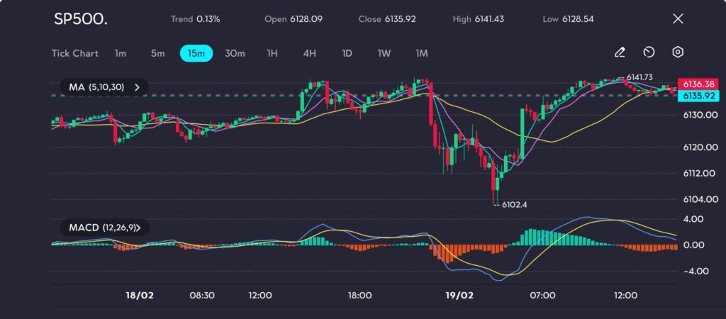 Picture: S&P 500 holds gains at 6,135.92, eyeing resistance at 6,141.73 amid cautious optimism, , as seen on the VT Markets app.