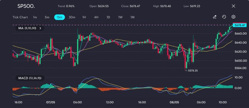 Picture: S&P 500 rebounds from 5578, surges to 5678 as bullish momentum reclaims control near resistance, as seen on the VT Markets app